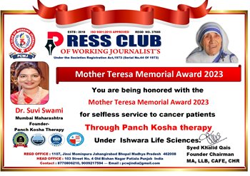 Bhopal. On the occasion of Women’s Day, like every year, the Press Club of Working Journalists, an all India registered organization committed to the safety and welfare of journalists, honored women personalities from across the country for their contribution towards the society. This year’s highest award of the association Mother Teresa Memorial Award 2023 has been awarded to a well-known celebrity wellness coach, meditator, currently cancer therapist, the mother of Panchkosha Therapy resident of Mumbai Dr. Srimati Suvi Swami.