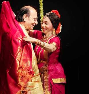 proving  her love to become one with Shiva eternally that ultimately  had Amba and Shiva merging as -Sambasadashiva  was what followed . It was visually  etched evocatively   by Dr Piyush Raj andDr Sunil Sunkara with  a deep rooted  commitment to do justice to its pulsating lyrical content penned by the great Master himself –   Padmashri  Puru Dadeech     What  a blessing  indeed  for the  experienced performers to present  the creation in  the witnessing presence of their  Mentor and  creator –  who had not only   penned lyrics  and compoosed it   but also choreographed  it.    It was a task whether to look at the Mentor watching  the disciples or  gather  him  through the  disciples !